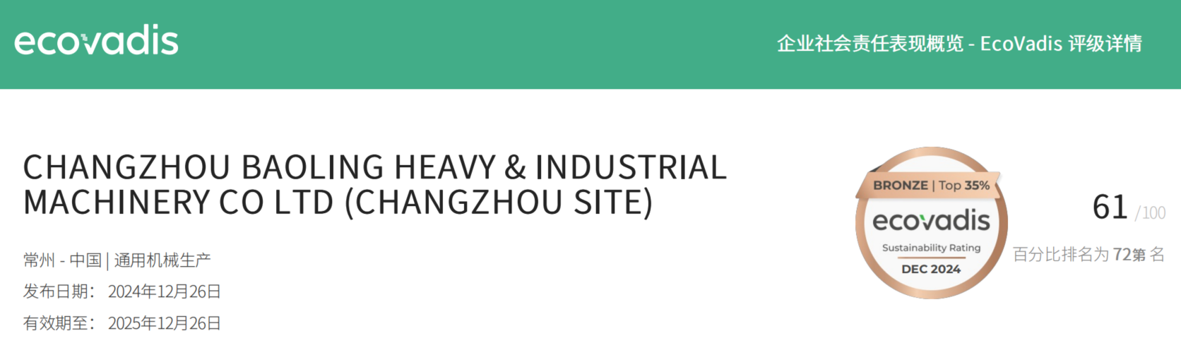 2024年12月26日,寶菱重工在EcoVadis企業(yè)社會責(zé)任評估中得分61分,并榮獲“銅牌”,在EcoVadis所有在評公司中躋身于前 35%(已超過 65% 以上的公司)。當(dāng)前,“環(huán)境、社會責(zé)任和公司治理”(簡稱:ESG)水平已成為衡量企業(yè)長期價(jià)值和可持續(xù)發(fā)展能力的關(guān)鍵因素,其核心在于“友好環(huán)境、尊重員工、合規(guī)經(jīng)營、可持續(xù)發(fā)展”。公司將可持續(xù)發(fā)展理念融入企業(yè)戰(zhàn)略與日程經(jīng)營活動(dòng)中,推動(dòng)導(dǎo)入ESG
